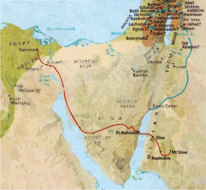 Dacă israeliții ar fi ales drumul spre Canaan, cel mai probabil ar fi luat-o pe Via Maris, drumul coastei Meditareneene care trecea prin Pentapolis sau cele cinci cetăți ale filistenilor: Gaza, Așchelon, Asdod, Ecron și Gat. Ruta aceast era cea mai scurtă cu drumuri bune și lesne de parcurs. Fiind un drum comercial, apa și alimentele nu erau o problemă, plus că peisajul era, probabil, unul deosebit. Însă cu toate avantajele amintite acest drum nu prezenta siguranță pentru un popor ce urma să fie declarat ca fugar de către faraonul care deja făcea planuri de a-i aduce înapoi.